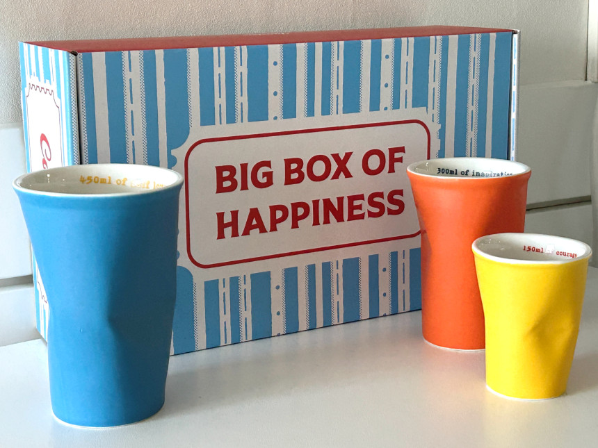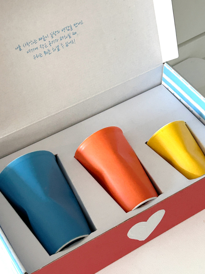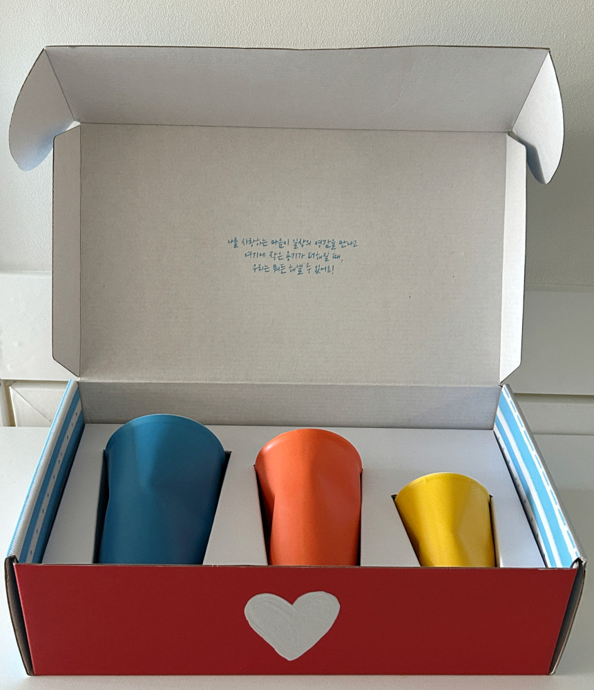 이 세 가지 마음을 담은 컵을 한 상자에 모았어요.